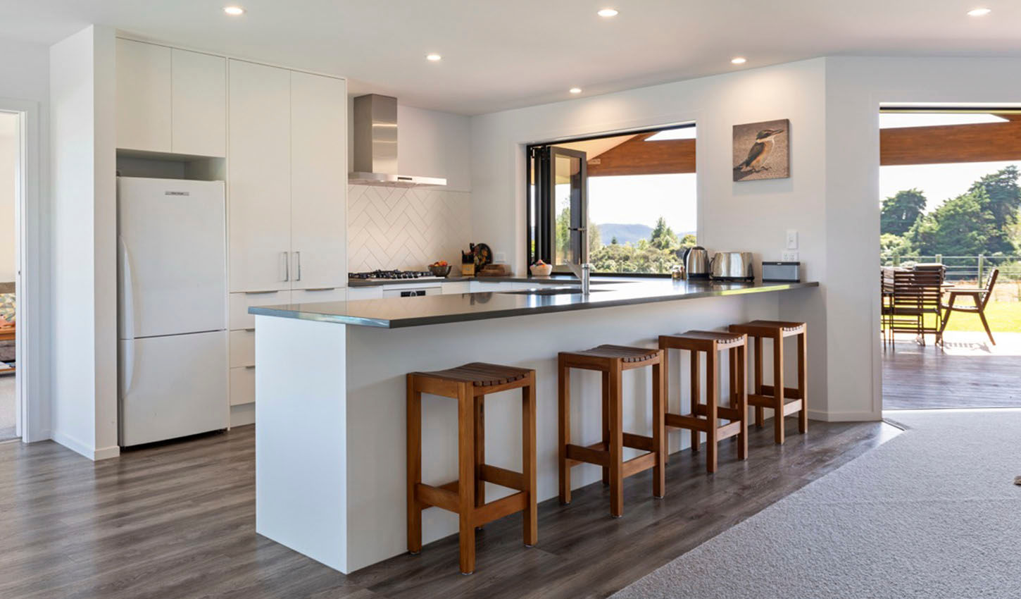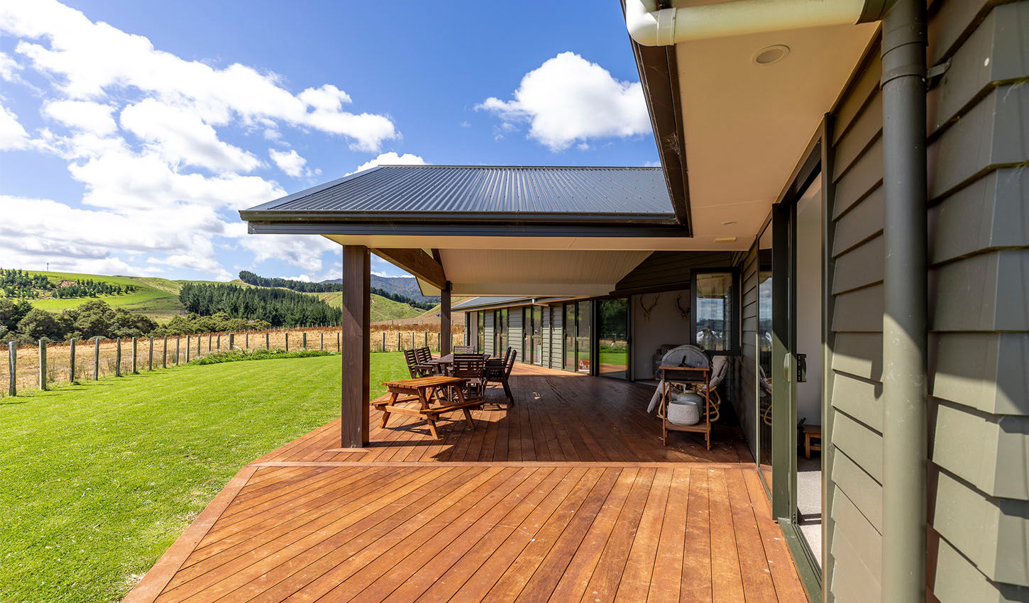 Sitting atop a scenic hill, this rural abode blends countryside vibes with modern comforts. Featuring expansive kwila decks, it's perfect for soaking up the stunning views and enjoying the great outdoors. With an over-wall sliding door connecting the lounge to the outside and a handy mudroom for farmers, this home effortlessly combines practicality with rural charm, offering a cozy retreat in the countryside.